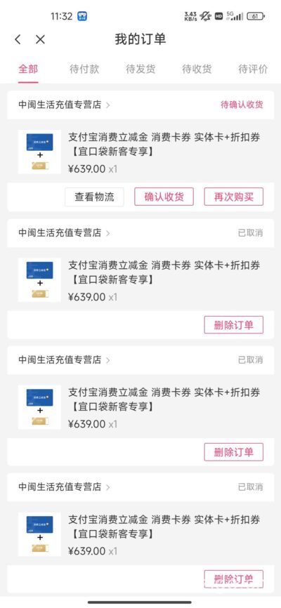 最近在宜口袋APP的分期商城看到支付宝立减金活动,500元面值的只要639元分3期买,感觉挺划算的,能在支付宝线上线下消费直接抵扣,就想着试试申请。没想到这过程一波三折,前前后后申请了6次,前5次全都失败了,第6次才终于审核通过,到账了立减金卡券。